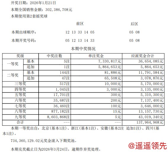 北京时间1月21日晚,体彩大乐透第26009期开奖澳门六合彩投注,当期开奖号码为前区05 12 13 14 33,后区05 08。
