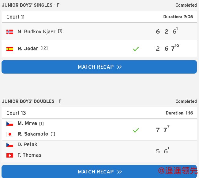 在青少组男单决赛中,17岁的西班牙选手拉斐尔-霍达尔(Rafael Jódar)用时2小时06分钟,在先丢一盘的情况下,连扳两盘,以2-6/6-2/7-6(10-1)逆转头号种子、挪威选手克亚尔夺冠。
